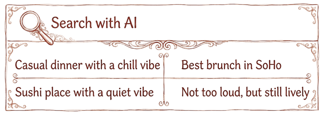 Find places through natural language — “quiet date spot,” “lively dinner in SoHo,” or “not too loud, but still fun.”