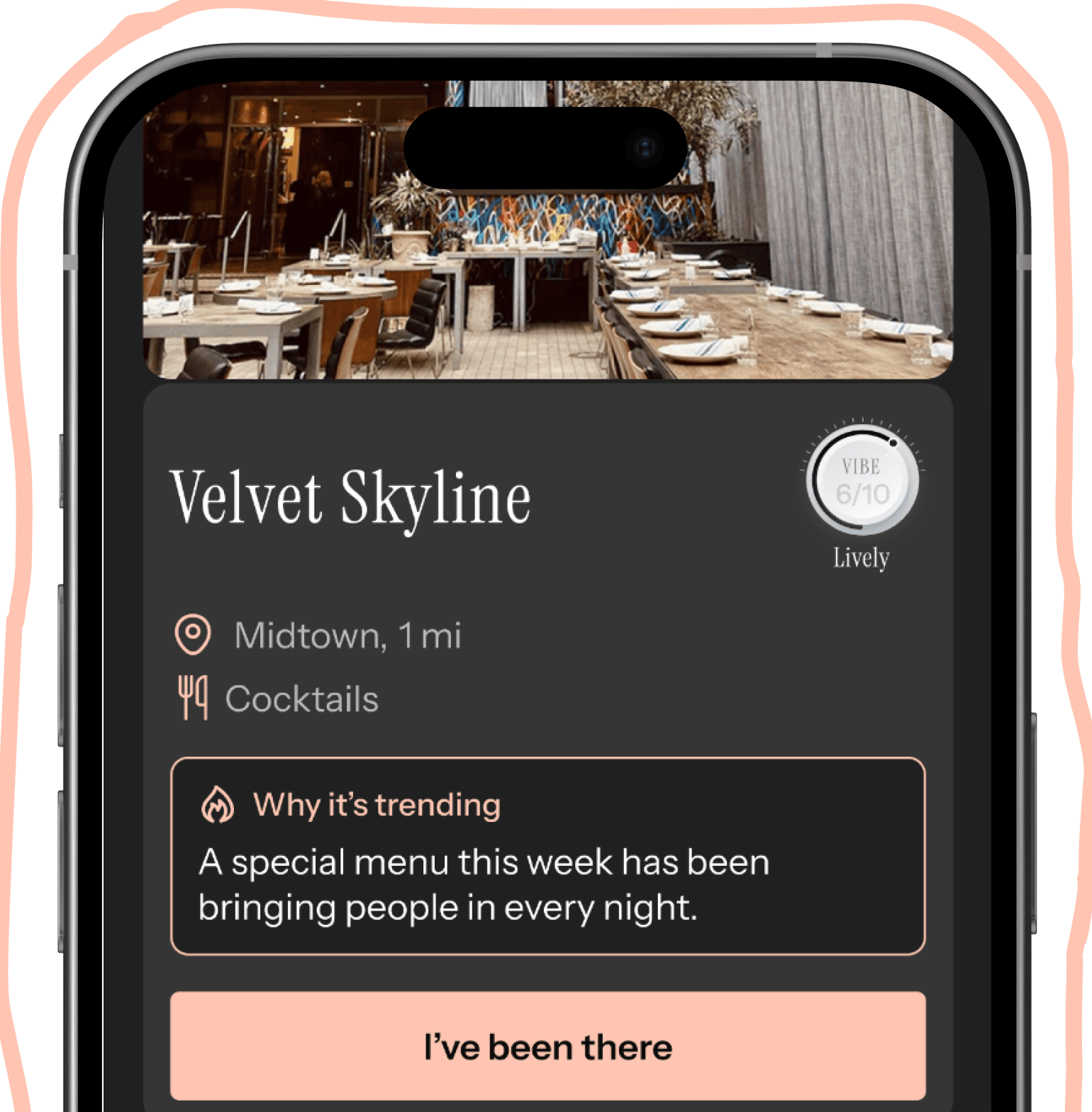 Tap “I’ve Been There” after the meal, leave your vibe rating, and build a history of the places that mattered.