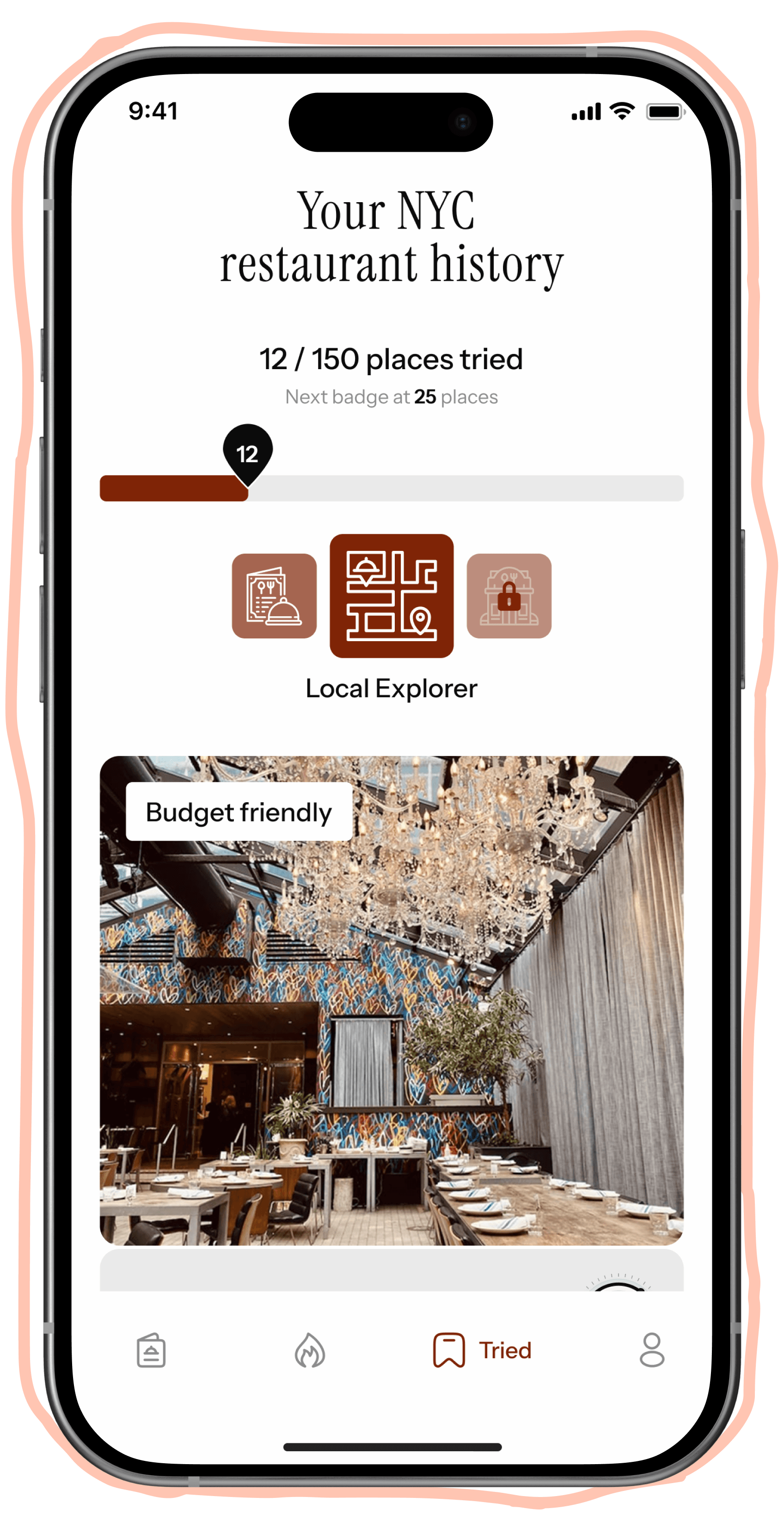 After a meal, tap "I've been there" to log the restaurant to your Tried tab. It takes a second — and slowly turns into something worth having: a real, personal account of the city you've been building through food.